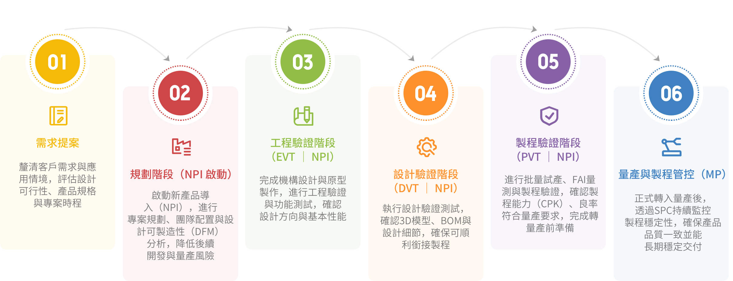 工程團隊以系統化製程管理,將產品製程劃分為四大階段,由專業工程團隊依階段落實執行,確保產品於實際應用中之穩定性與安全性,並以「工程就是承諾,品質就是生命」為核心服務理念。
